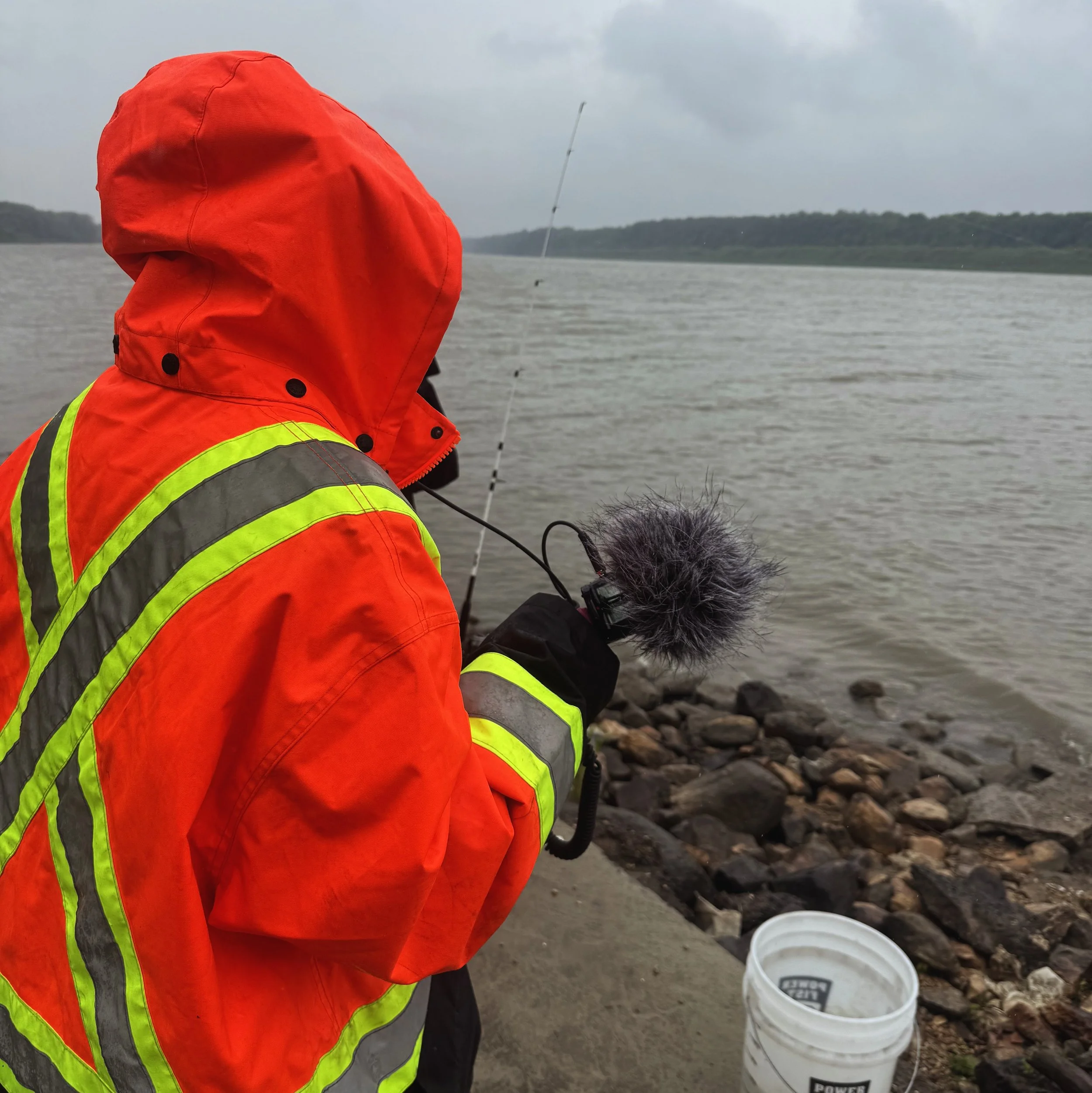 That neon orange shape is me recording environmental sounds. The weather seemed, at first, unfortunate. There were heavier winds and it rained periodically. What I didn’t expect was for the wind to create a beautiful audio of the waves crashing onto the shore. If you listen to this soundscape with headphones on, the wave moves from one ear to the other, perfectly capturing how it hit the shore while we were fishing.